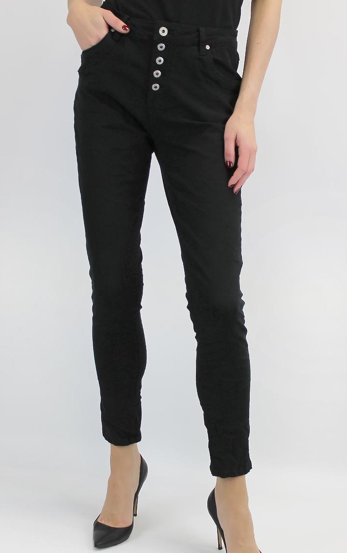 Modellen har trendiga knappar och extra sömnadsdetaljer runt fickorna både fram- och baktill.