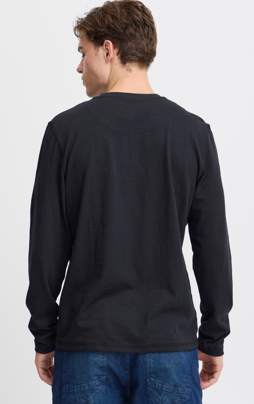 *Ribbad kant i halsringningen följt av henley med tre knappar.