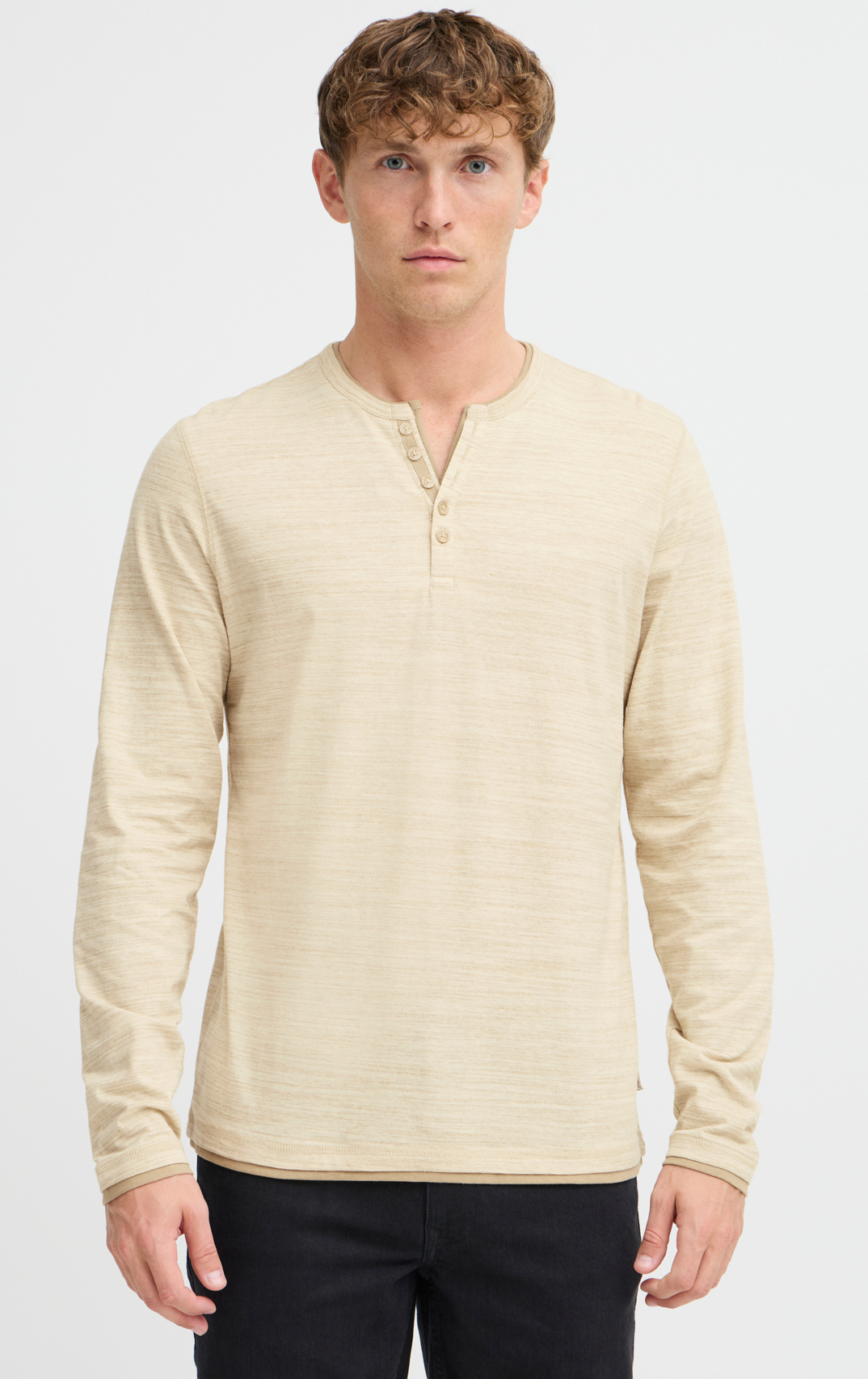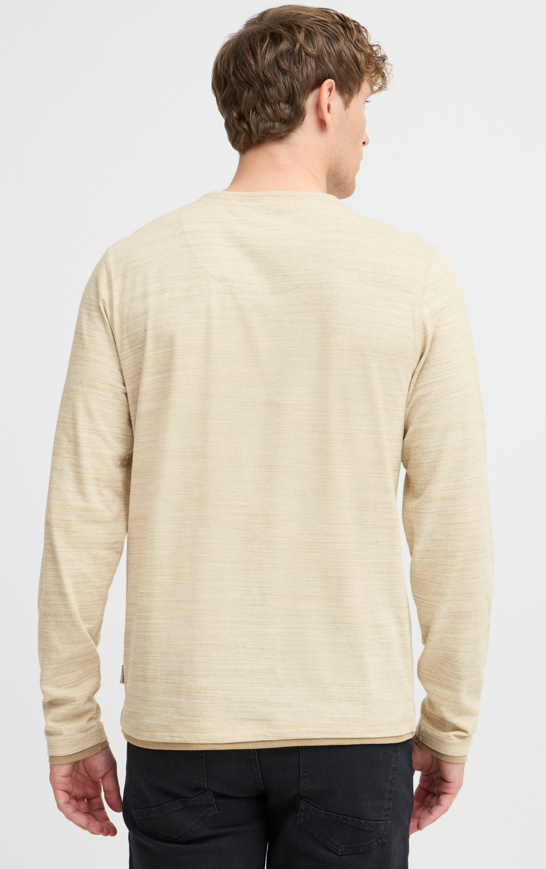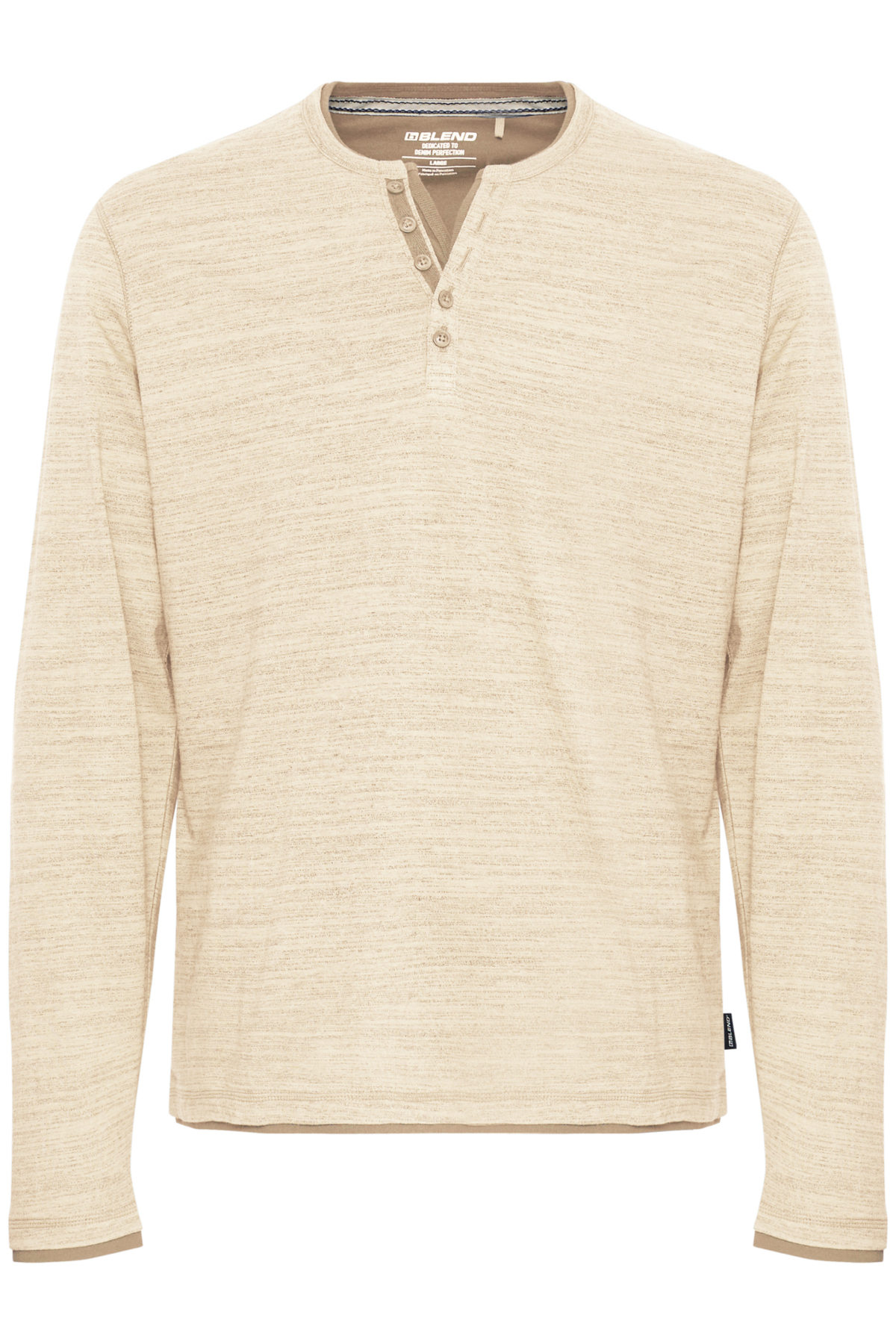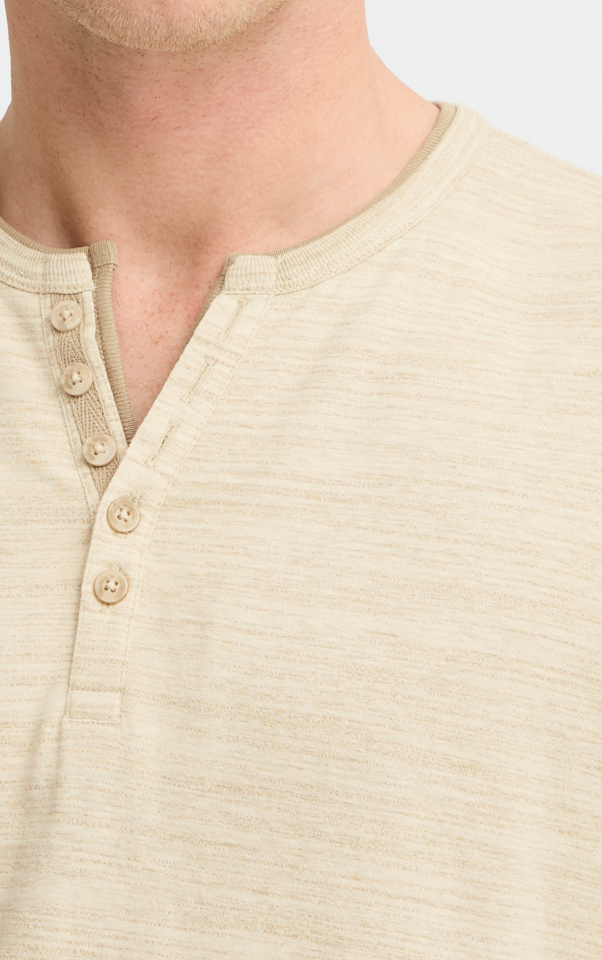 *Dubbelt avslut i halsringningen med kontrast följt av V-skuren henley där det också är kontrastmaterial.