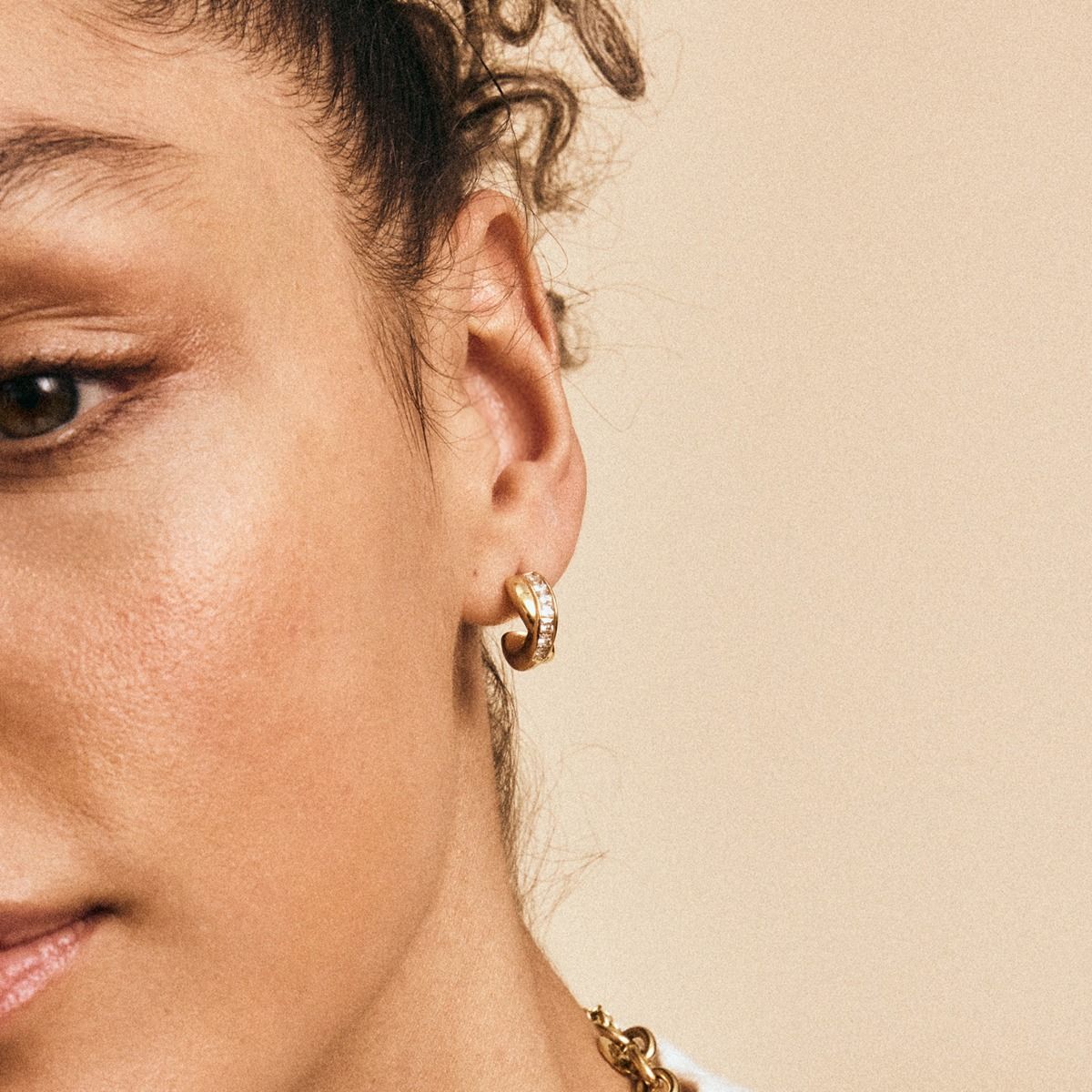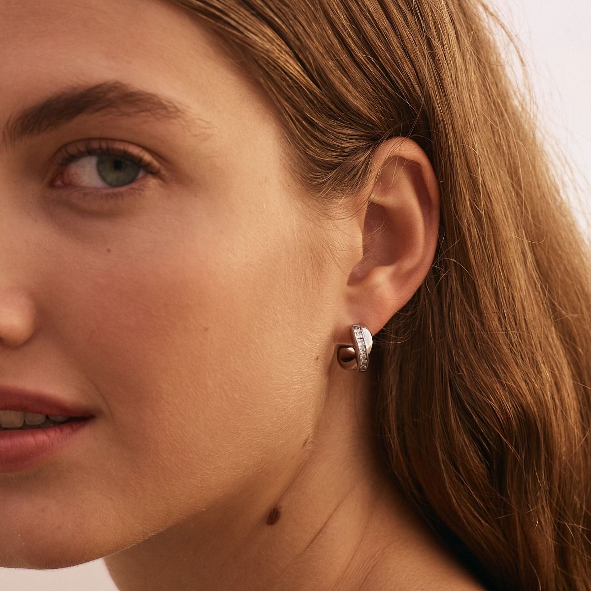 Klassiska serien Andorra har här ett mjukare formspråk med sina två rundade skenor lagda omlott, en med klara stenar och en utan. Eleganta små creoler som passar alla och är en fin uppskattad present.