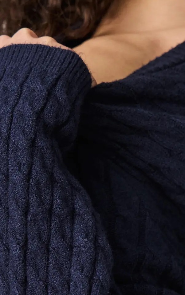 *Gjord i stickad viskos-mix med riktigt mjuk, följsam känsla samt fin lyster och ett lite tyngre fall i materialet fast att det är en ganska tunn stickning. Kabelstickat mönster över hela plagget.