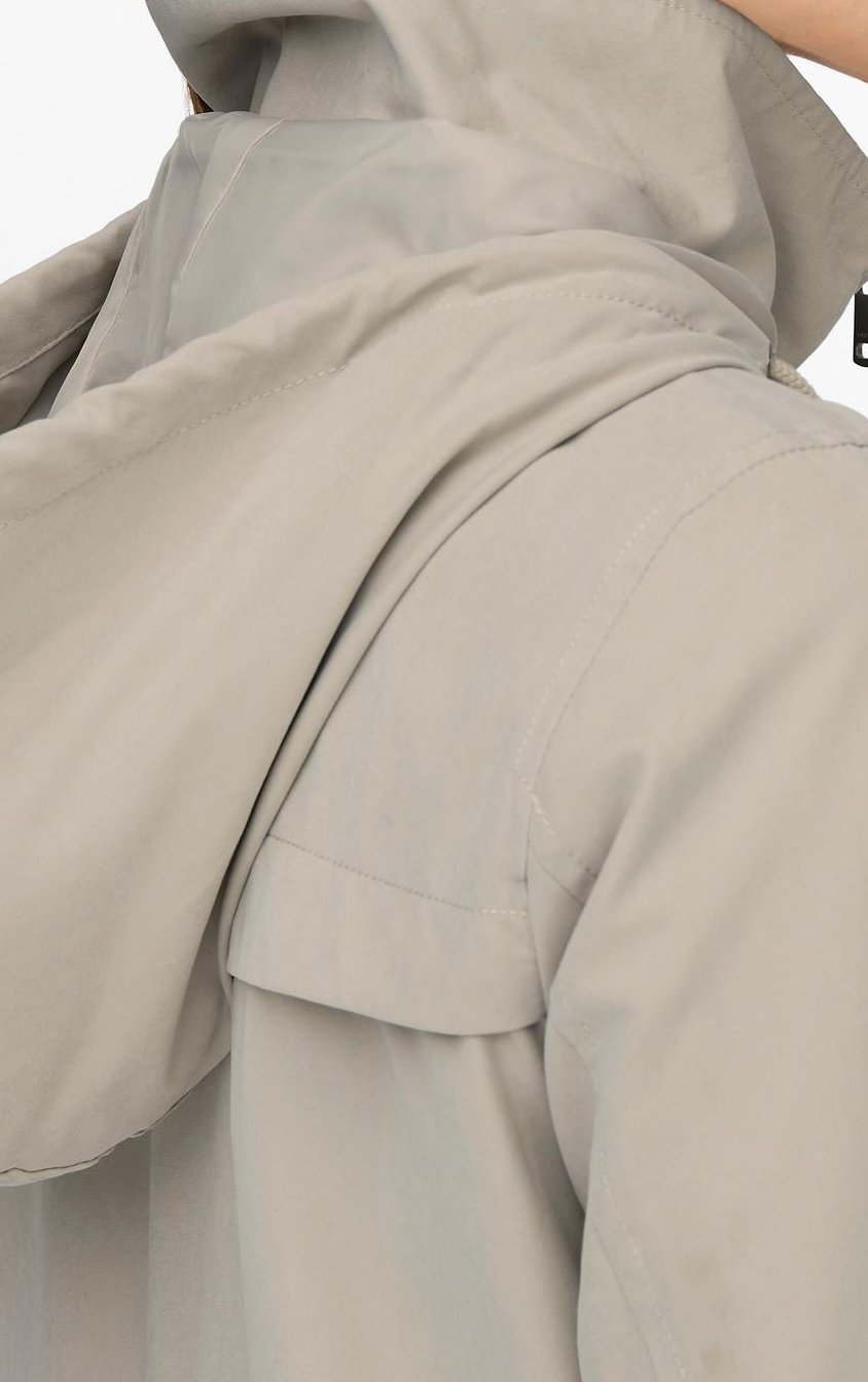 Modellen har större huva som sitter fast men ändå krage som går hela vägen upp i halsen. Jackan är bara fodrad i tunt polyestertyg och inte fylld så den lämpar sig bäst för senare vår och tidig sommar eller med en tjockare tröja under så kan den börja användas redan tidigt på våren.